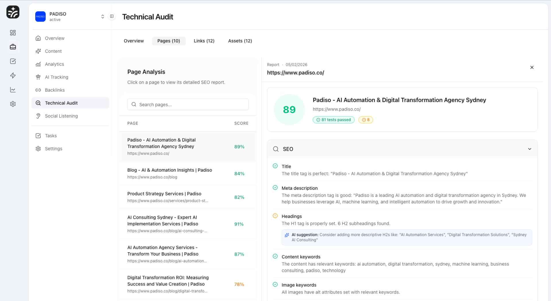 Comprehensive technical SEO audits that find every issue affecting your site. Get prioritized fixes and track your site health score over time.